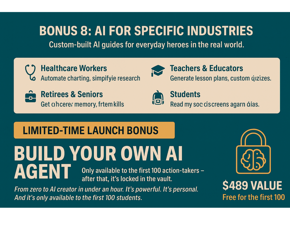 Build Your Own AI Agent: his is what we call Bonus-X. The first 100 people to pull the trigger on the "Ai for Average Joes" course package will get something EXTRA special that nobody else can buy, a seat at our LIVE AI Agent Workshop next month. (either in-person or virtually) We're talking hands-on, step-by-step building of actual AI agents that work in ANY industry. Not just watch. Not just learn. Actually BUILD. You'll create your own agent plus get 4 more to experiment with at home. Think of it as your personal AI army, custom-built by you.